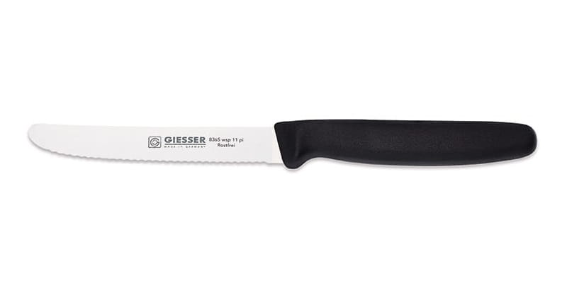 Jeśli szukasz noża, który pokroi wszystko – od miękkiego pomidora, przez chrupiącą bułkę, aż po twardy ser – właśnie go znalazłeś. Giesser 8365 to uniwersalny pomocnik kuchenny z ząbkowaną krawędzią tnącą, który w świecie gastronomii zyskał miano niezawodnego „pikutka”. Czarna rękojeść nadaje mu nowoczesny, elegancki wygląd, który idealnie komponuje się z każdą kuchnią.
