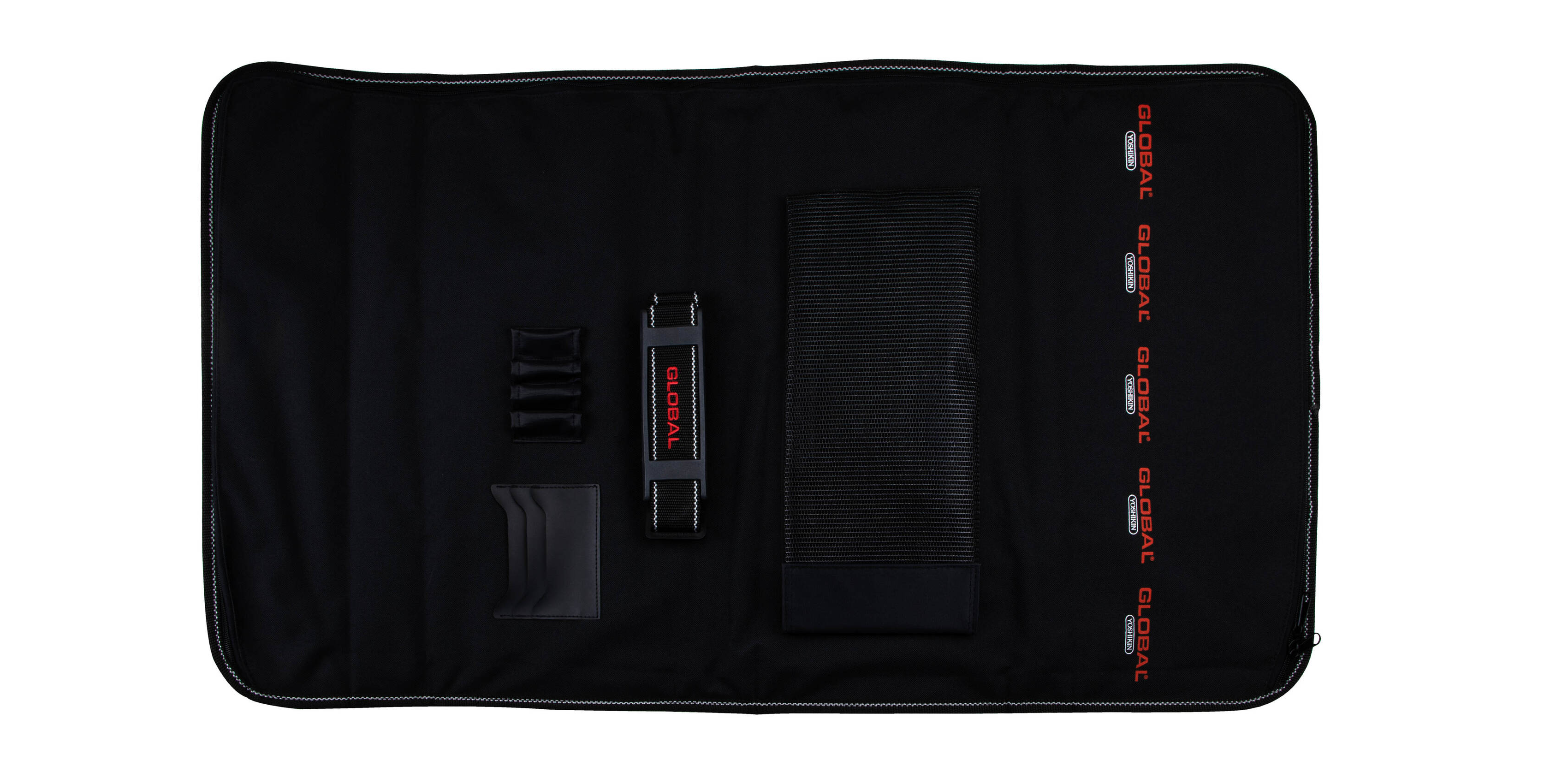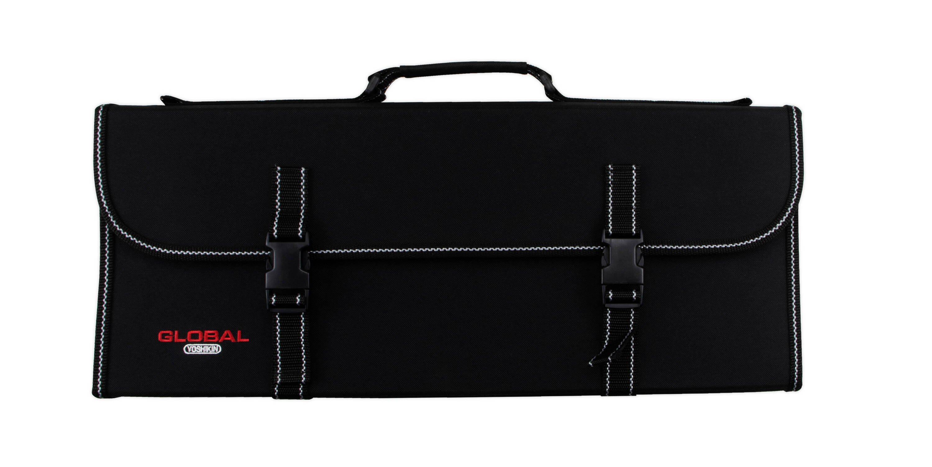 Usztywniona, składana torba z solidnego nylonu, w której można bezpiecznie przewozić i przechowywać noże Global. Wyposażono ją w wygodną rączkę i doczepiany pasek. Torba jest zapinana na klamry i posiada szesnaście kieszeni na różnej wielkości noże oraz przestrzeń na dodatkowe akcesoria. Komora z nożami zapinana jest w całości na zamek błyskawiczny.