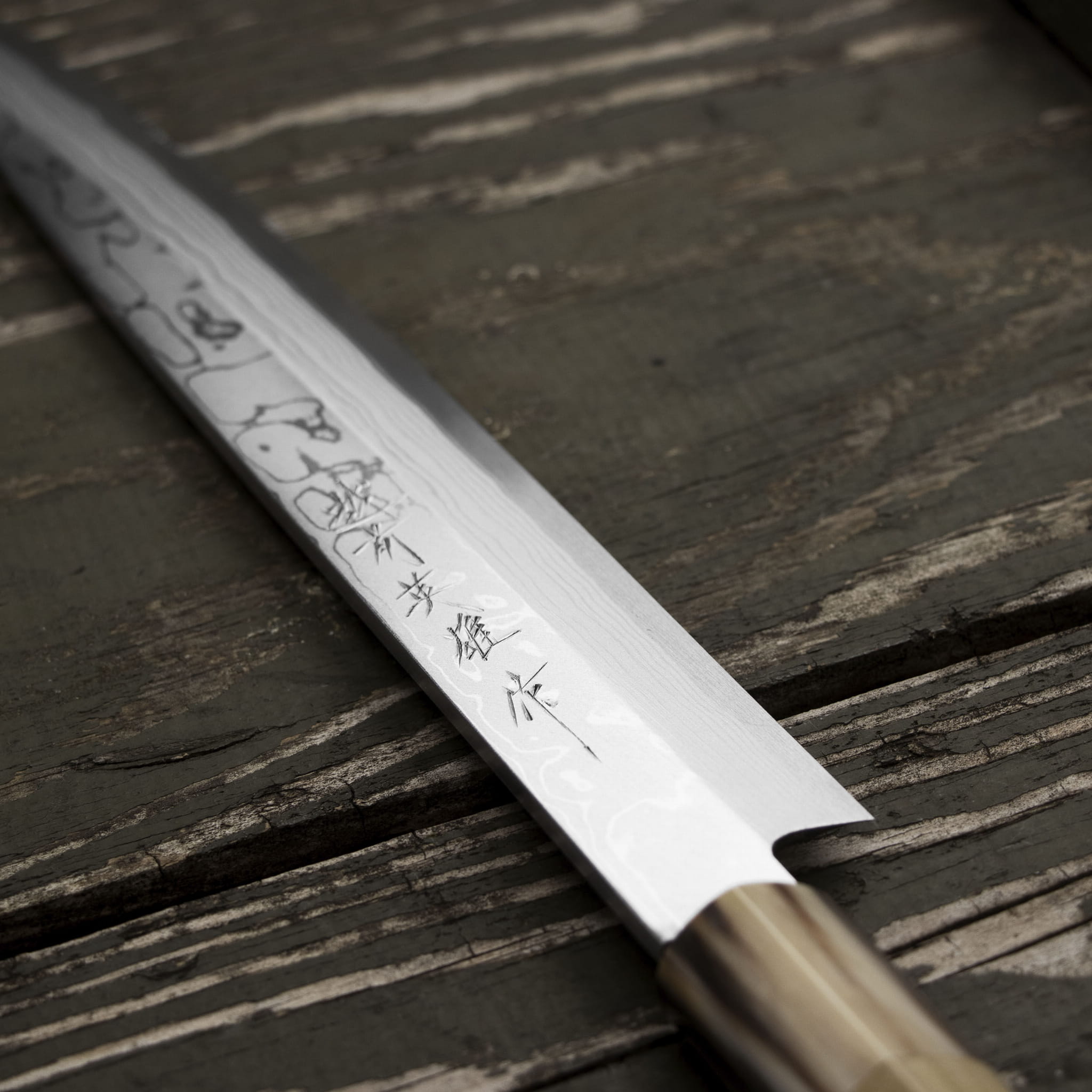 Hideo Kitaoka Aogami#2 Satin Damascus Nóż Yanagiba 24 cm