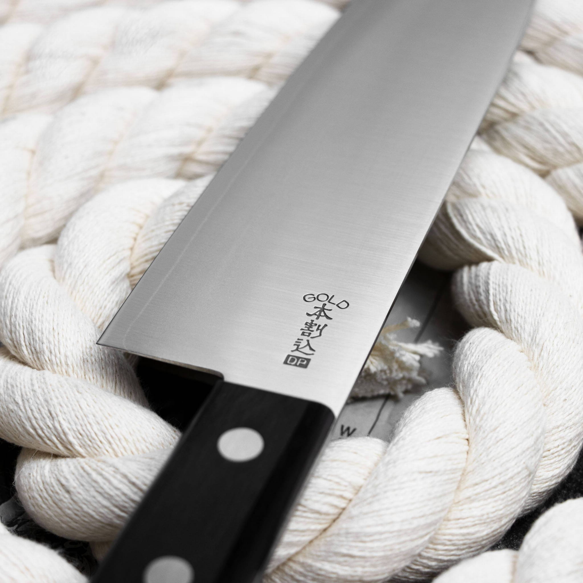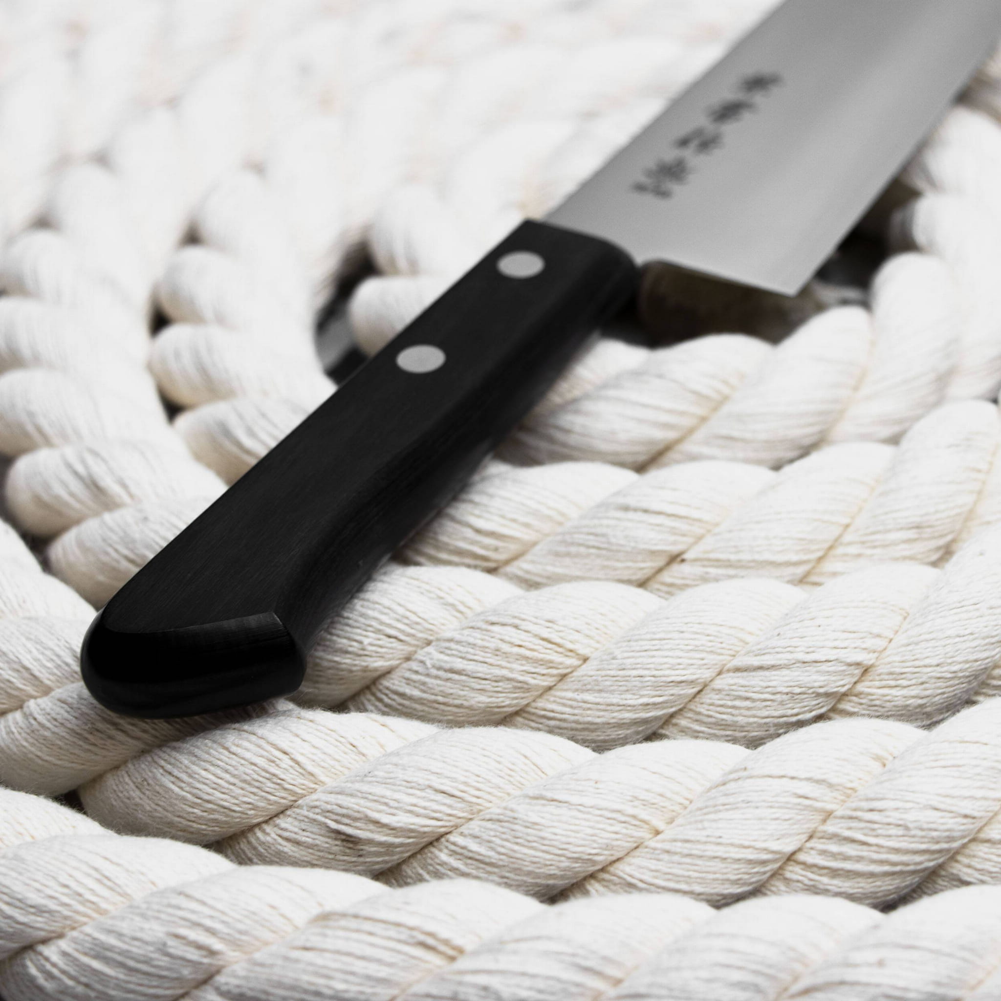 Wszechstronny japoński nóż kuchenny, przeznaczony do krojenia warzyw, owoców, mięsa i ryb. Szeroka klinga ułatwia przenoszenie pokrojonych produktów do salaterki lub na patelnię i przydaje się też do rozgniatania czosnku. Santoku, który łączy w sobie funkcje noża szefa kuchni i japońskiego noża do warzyw Nakiri, ma wysoko umieszczoną rękojeść, która zapobiega uderzaniu kłykciami o deskę.