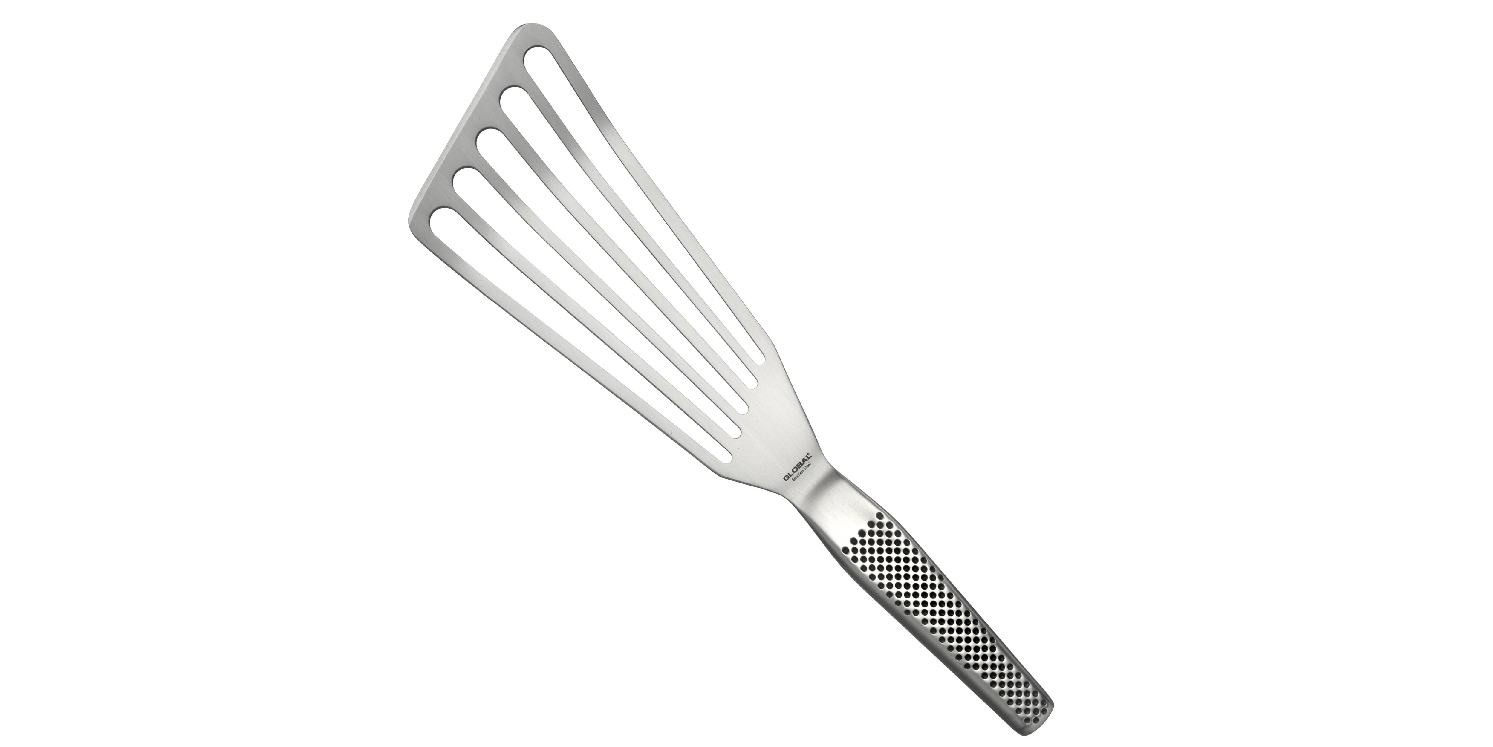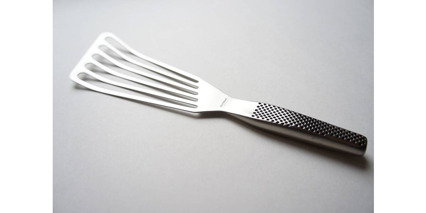 Szeroka łopatka cedzakowa to wszechstronne narzędzie do przewracania delikatnych potraw i odsączania ich z nadmiaru płynu. Znakomicie się sprawdza podczas przyrządzania ryb, jaj w koszulkach czy omletów. Łopatka Global jest cienka, elastyczna i lekko zaostrzona, więc można ją gładko wsunąć np. pod smażony filet, który przywarł do patelni. Została wyprofilowana w taki sposób, żeby ułatwić przenoszenie szerszych elementów. Fakturowana rękojeść nie wyślizguje się z rąk.
