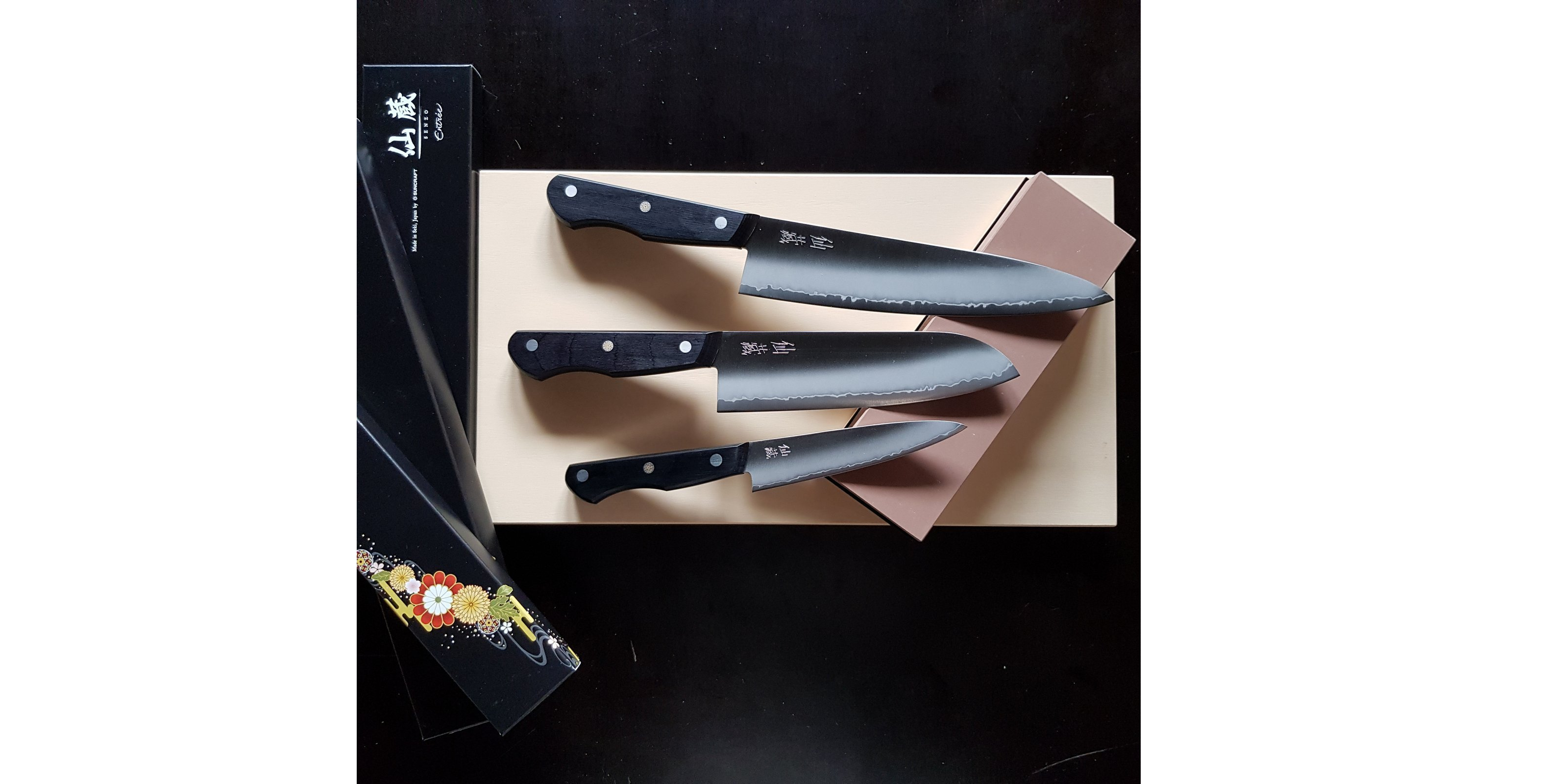 SENZO ENTREE to linia otwierająca serię produktów firmy SUNCRAFT. Ostrza noży z tej serii wykonano z platerowanej stali 3-warstwowej typu AUS-8. Jest to stal podobna do serii 440 i zawiera dodatek wanadu zwiększający jej twardość. Stal ta należy do stali nierdzewnych, czyli stali o podwyższonej odporności na korozję.