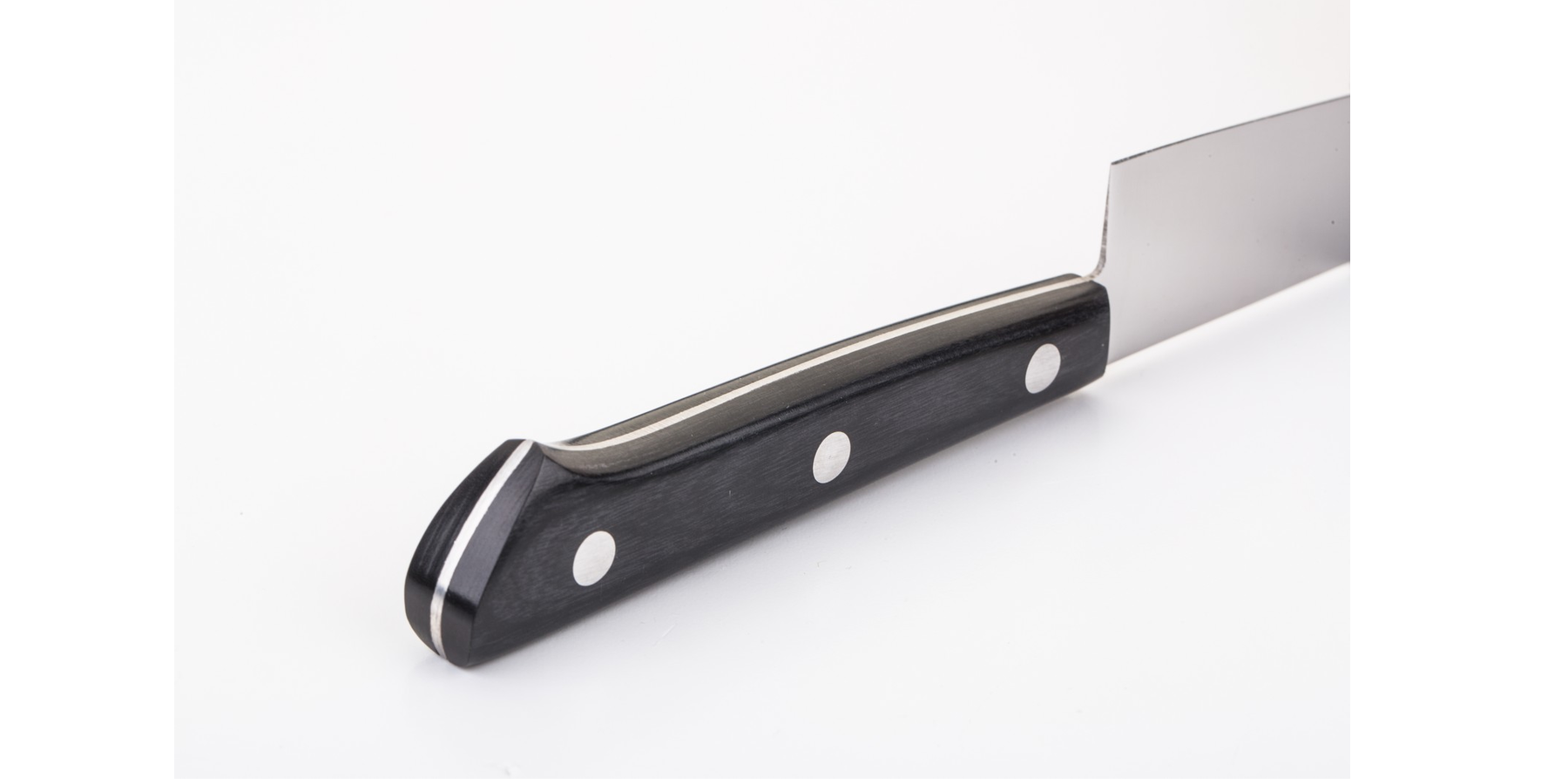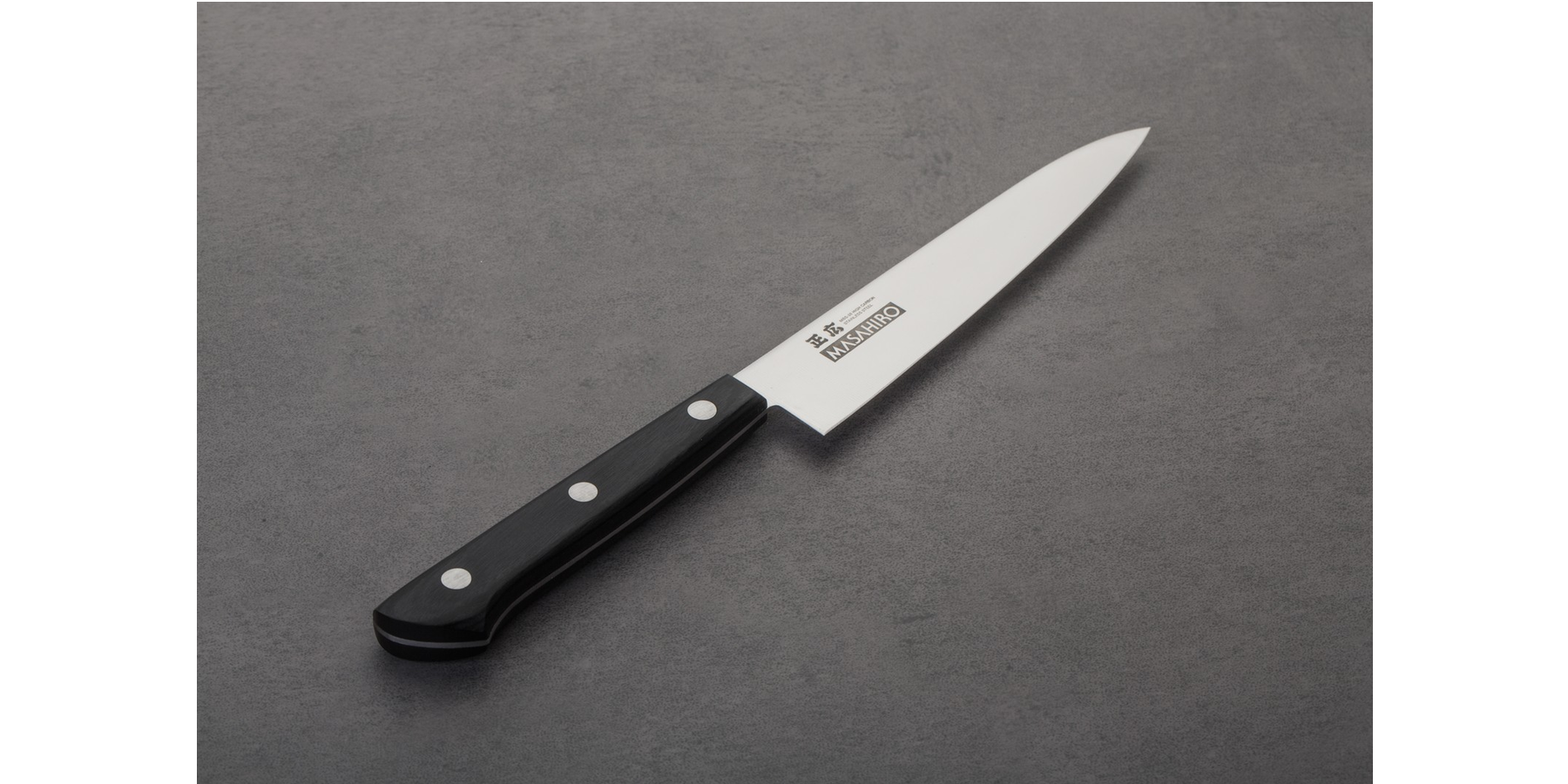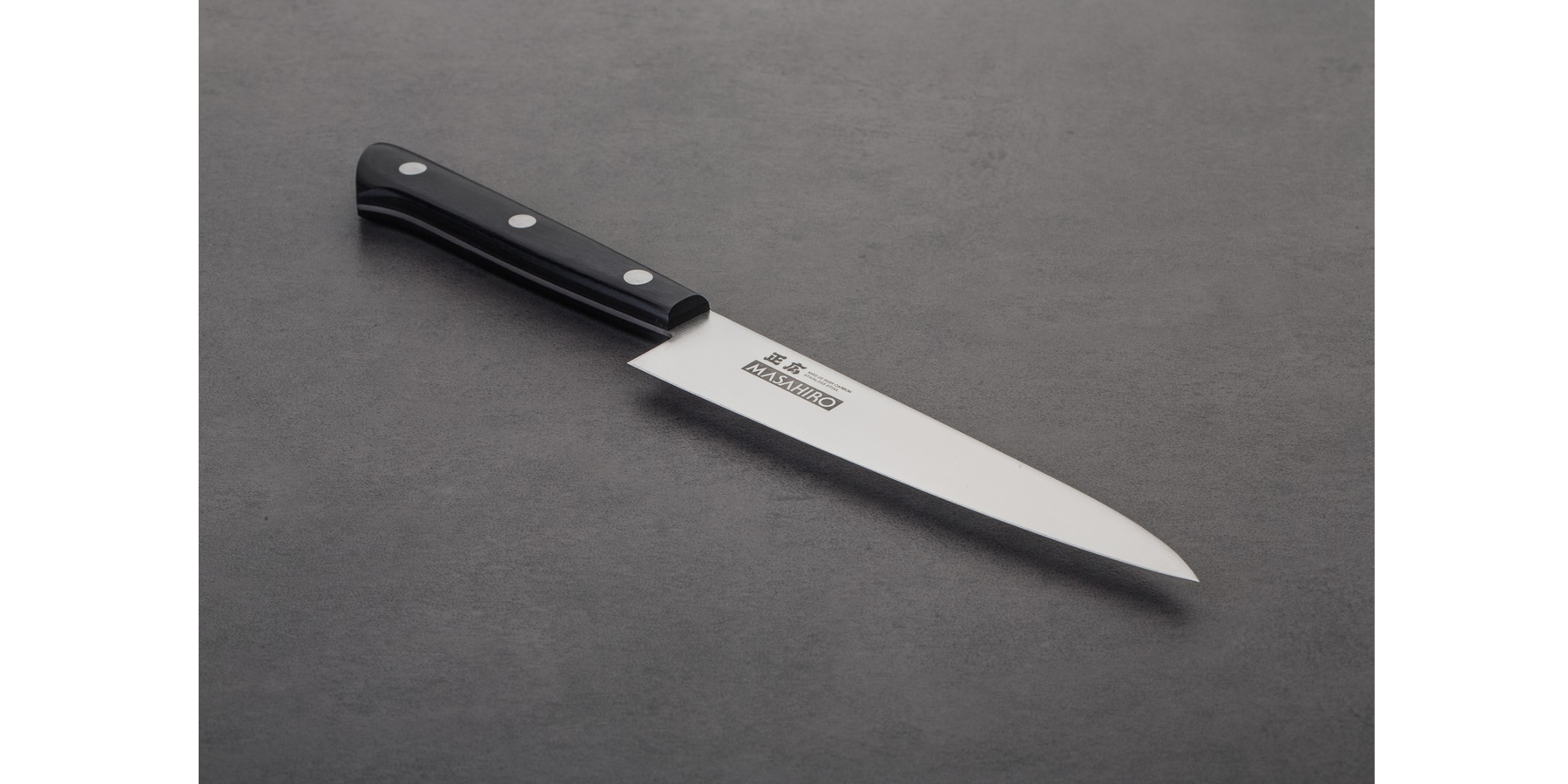 Masahiro MV-L Utility o ostrzu długości 150 mm to uniwersalny nóż będący mniejszą wersją noża szefa kuchni. Jego wszechstronne zastosowanie, sprawdzające się wszędzie tam gdzie nóż szefa jest za duży, czynią go niezbędnym elementem wyposażenia kuchni.