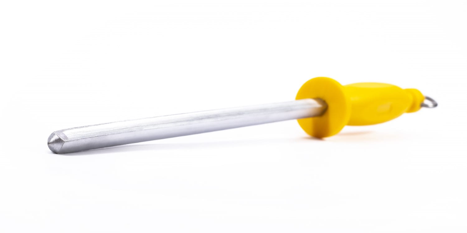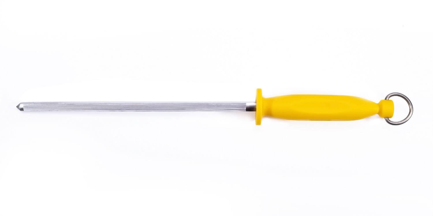 Przeciągnij ostrze noża wzdłuż całej długości ostrzałki delikatnie przyciskając, następnie powtarzaj czynność po drugiej stronie ostrza noża.