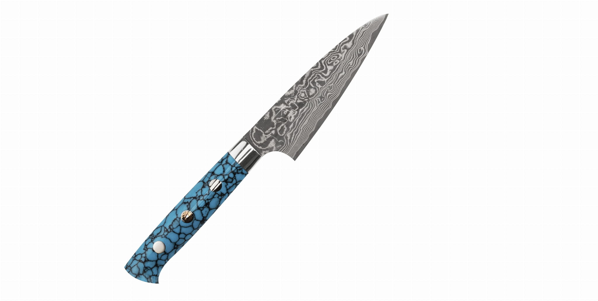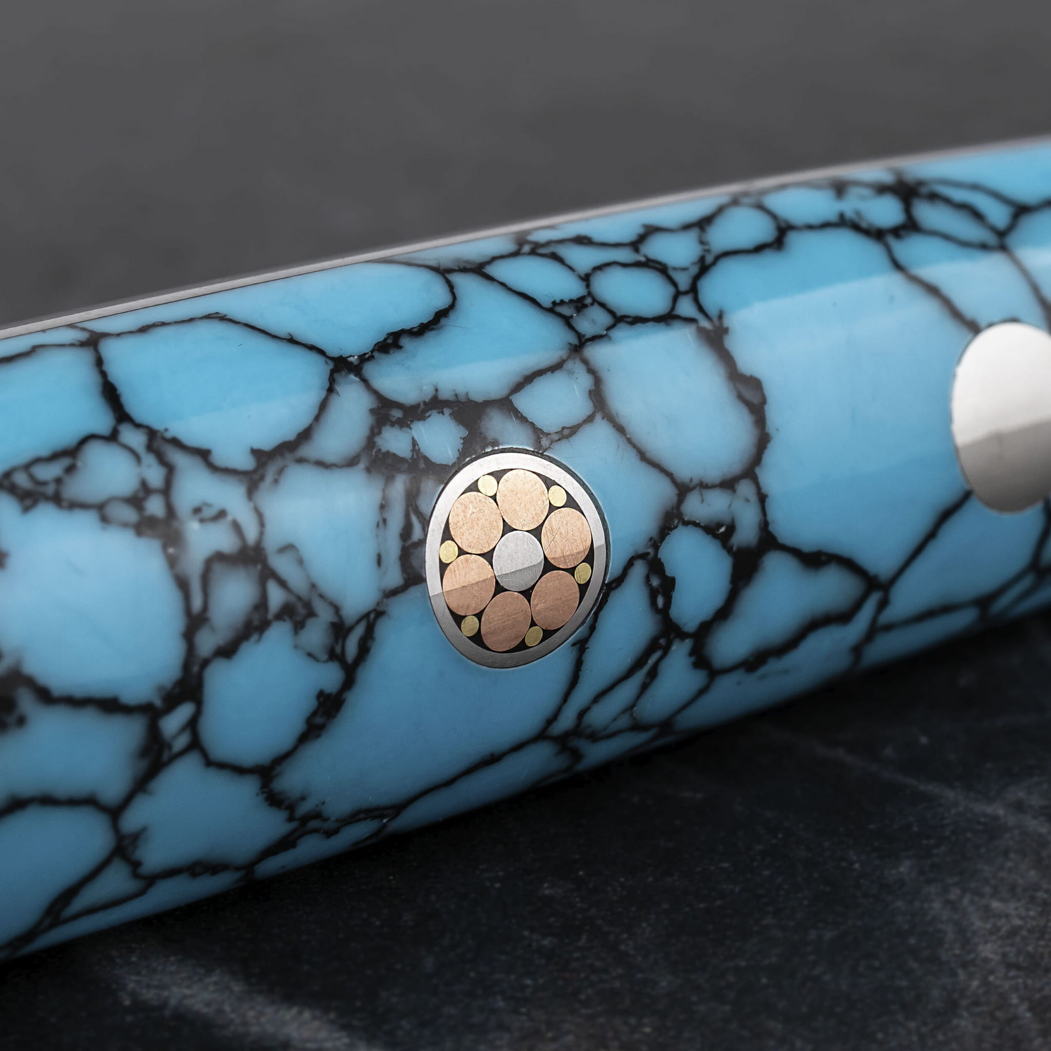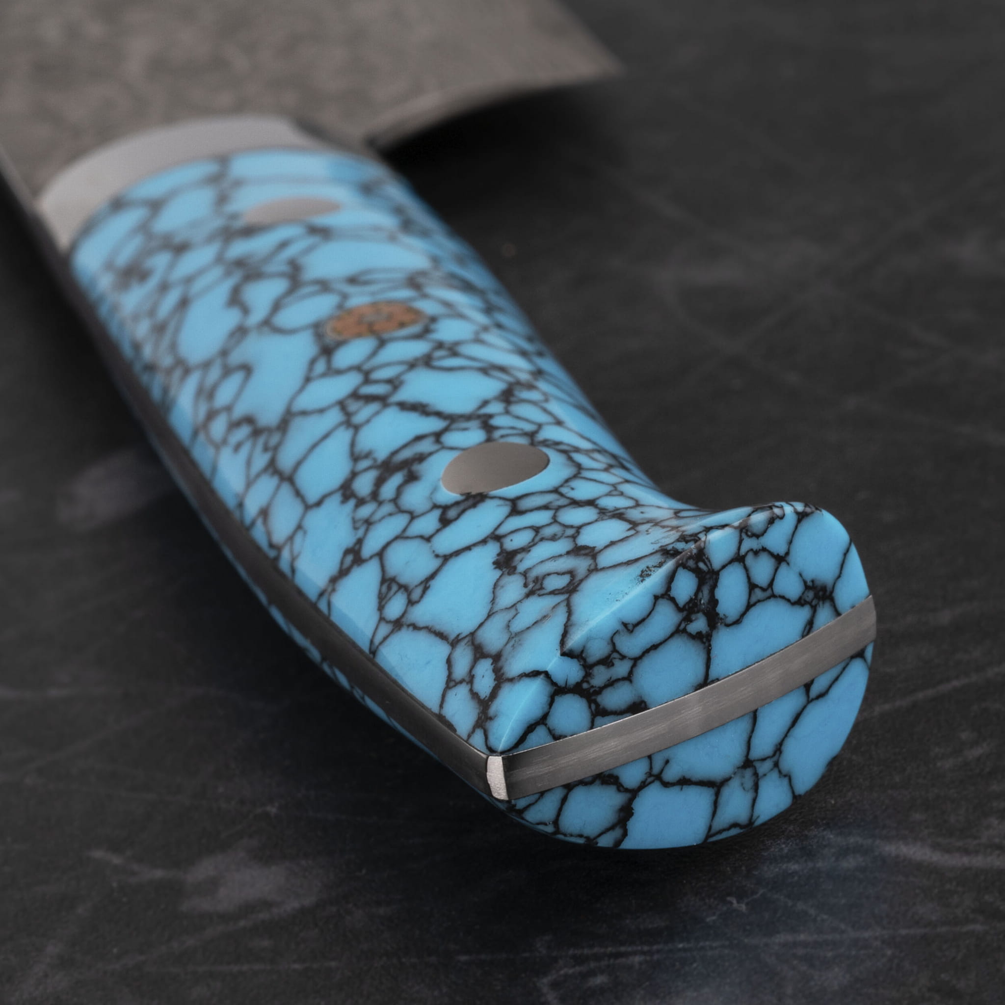 Rękojeść – niebieski turkus ze stalowym bolsterem wykończonym na wysoki połysk
