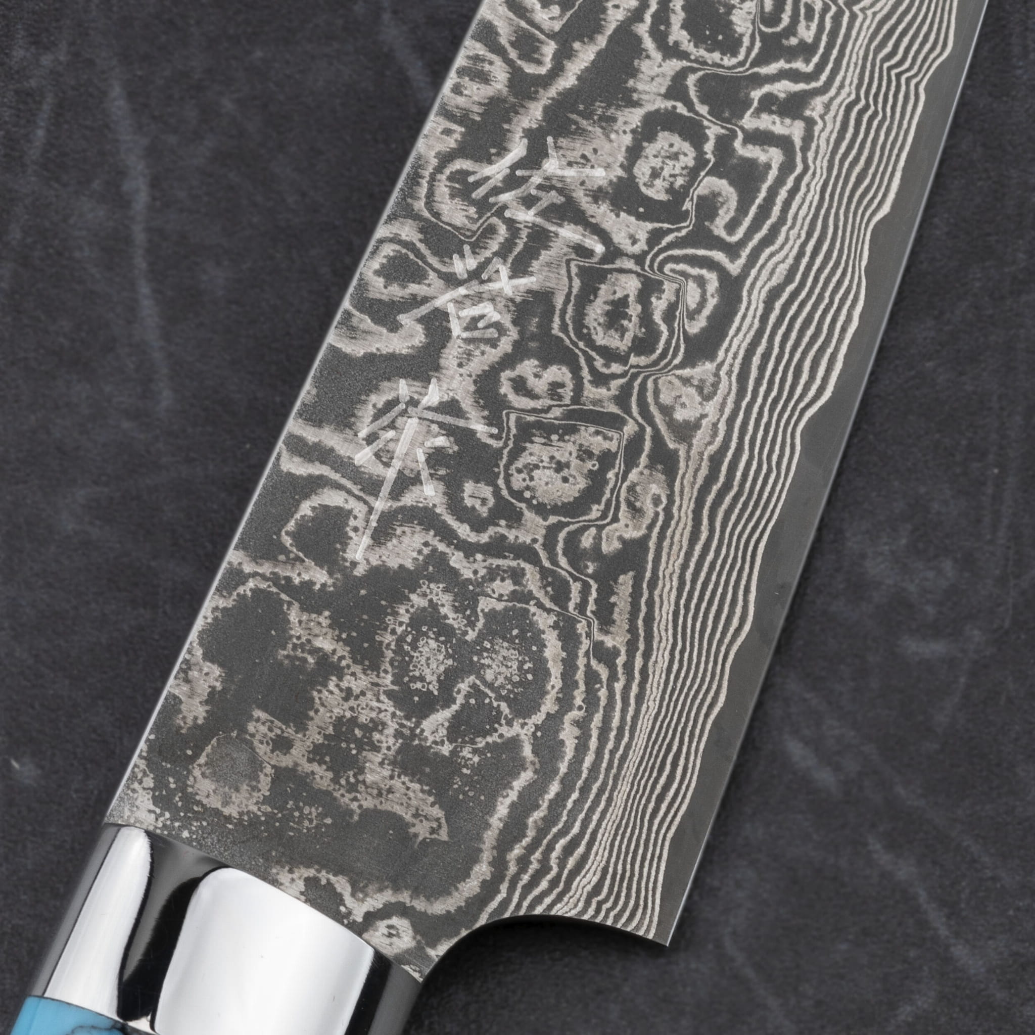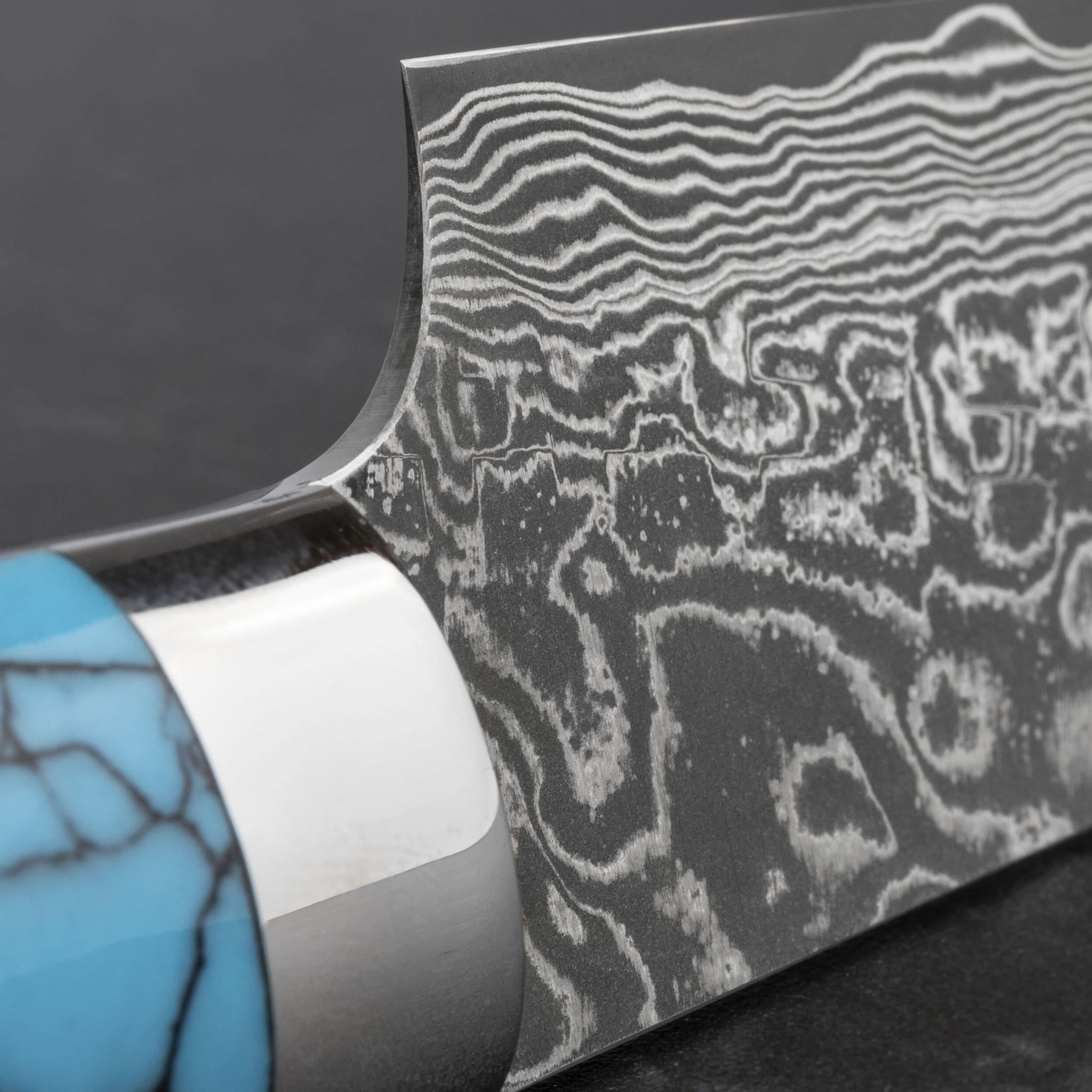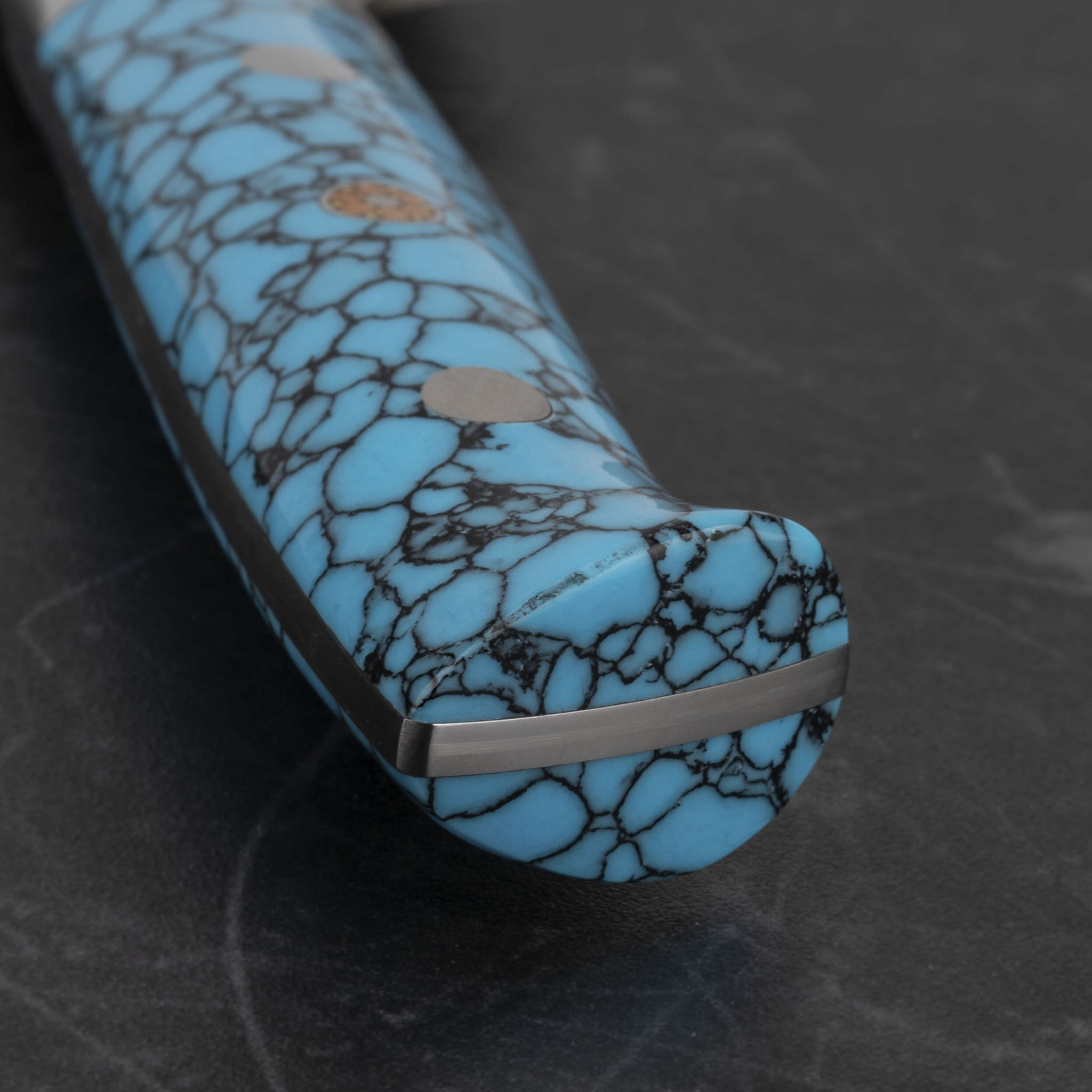 Rękojeść – niebieski turkus ze stalowym bolsterem wykończonym na wysoki połysk