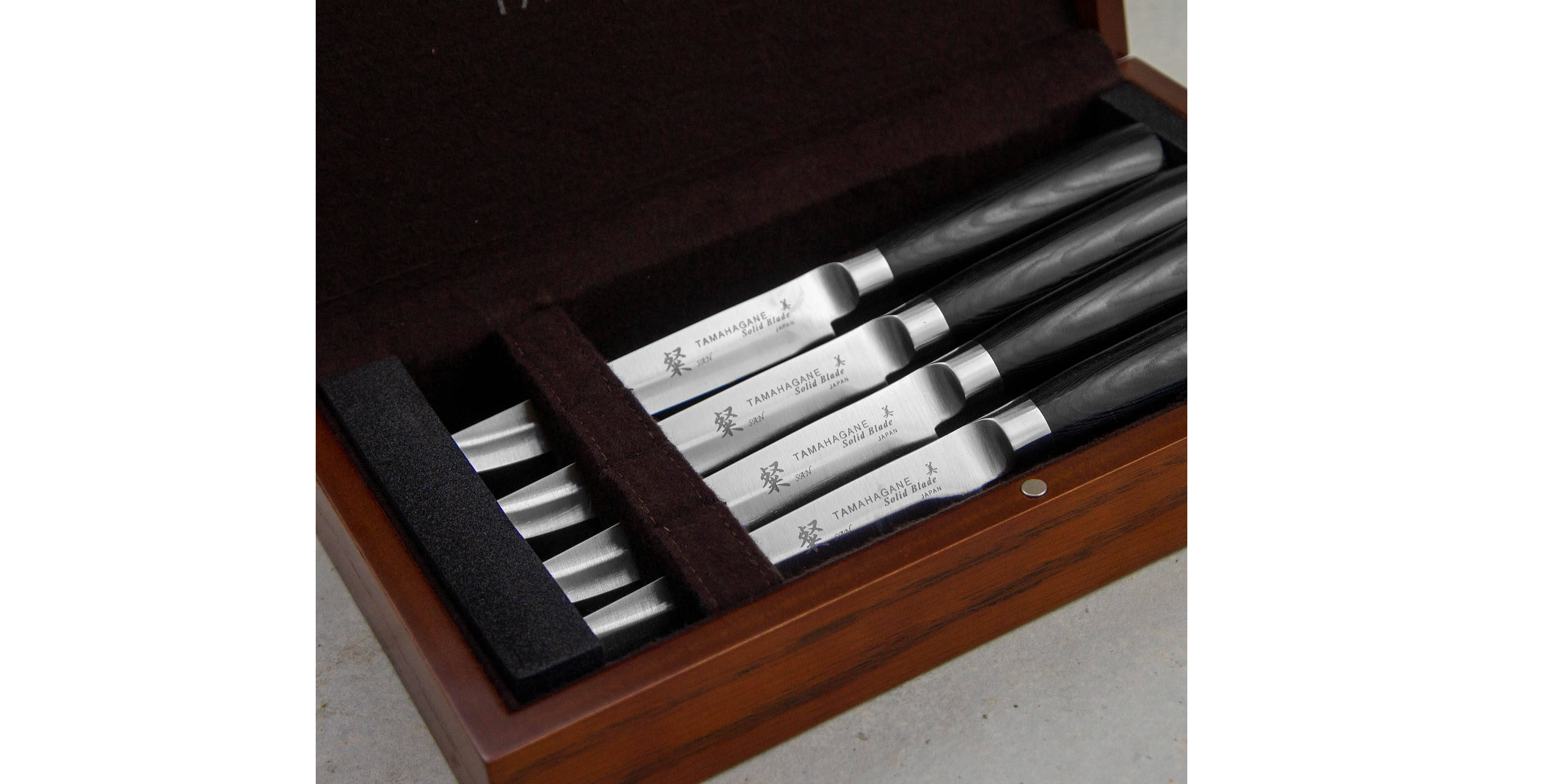 Jest to niezbędna pozycja dla każdego fana steków. Ułatwiają krojenie steków, noże o gładkiej krawędzi tnącej zapewniają czystsze cięcie niż noże ząbkowane. Dodatkowo można je naostrzyć w domowych warunkach przy pomocy ostrzałki kółkowej lub kamienia do ostrzenia. Noże wykonane są z nierdzewnej stali VG-5 o twardości 61 HRC. Drewniane pudełko sprawdzi się świetnie jako prezent.