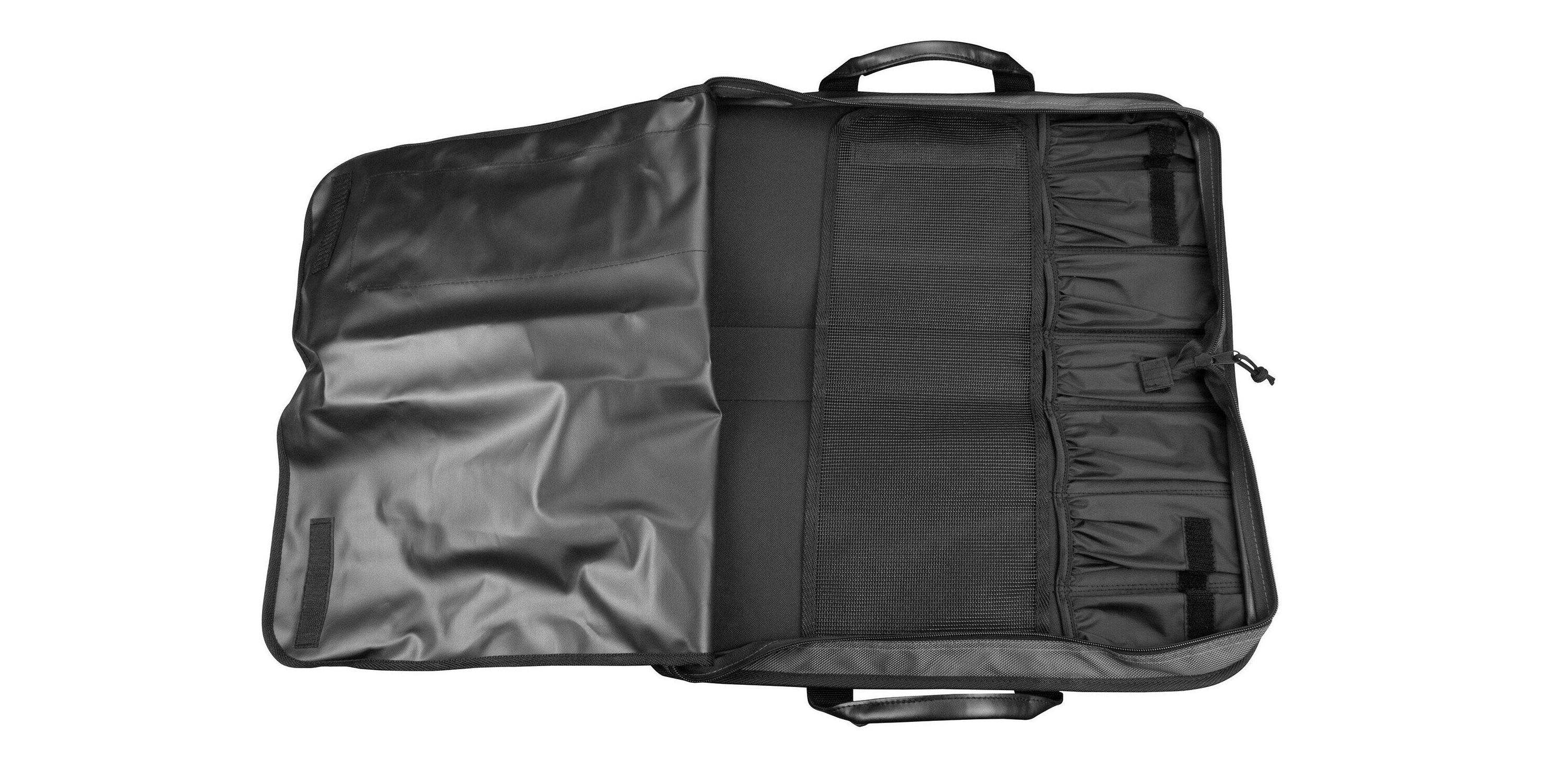 Elegancka, zamykana na suwak teczka firmy Tamahagane pozwala bezpiecznie i łatwo transportować noże kuchenne. Doskonale się też sprawdza jako wygodny sposób na przechowywanie noży w miejscu pracy. Teczkę wykonano z czarnego, odpornego na przedarcia nylonu, który łatwo się czyści za pomocą wody z łagodnym detergentem. Solidny zamek błyskawiczny pomaga chronić zawartość teczki przez cały czas.