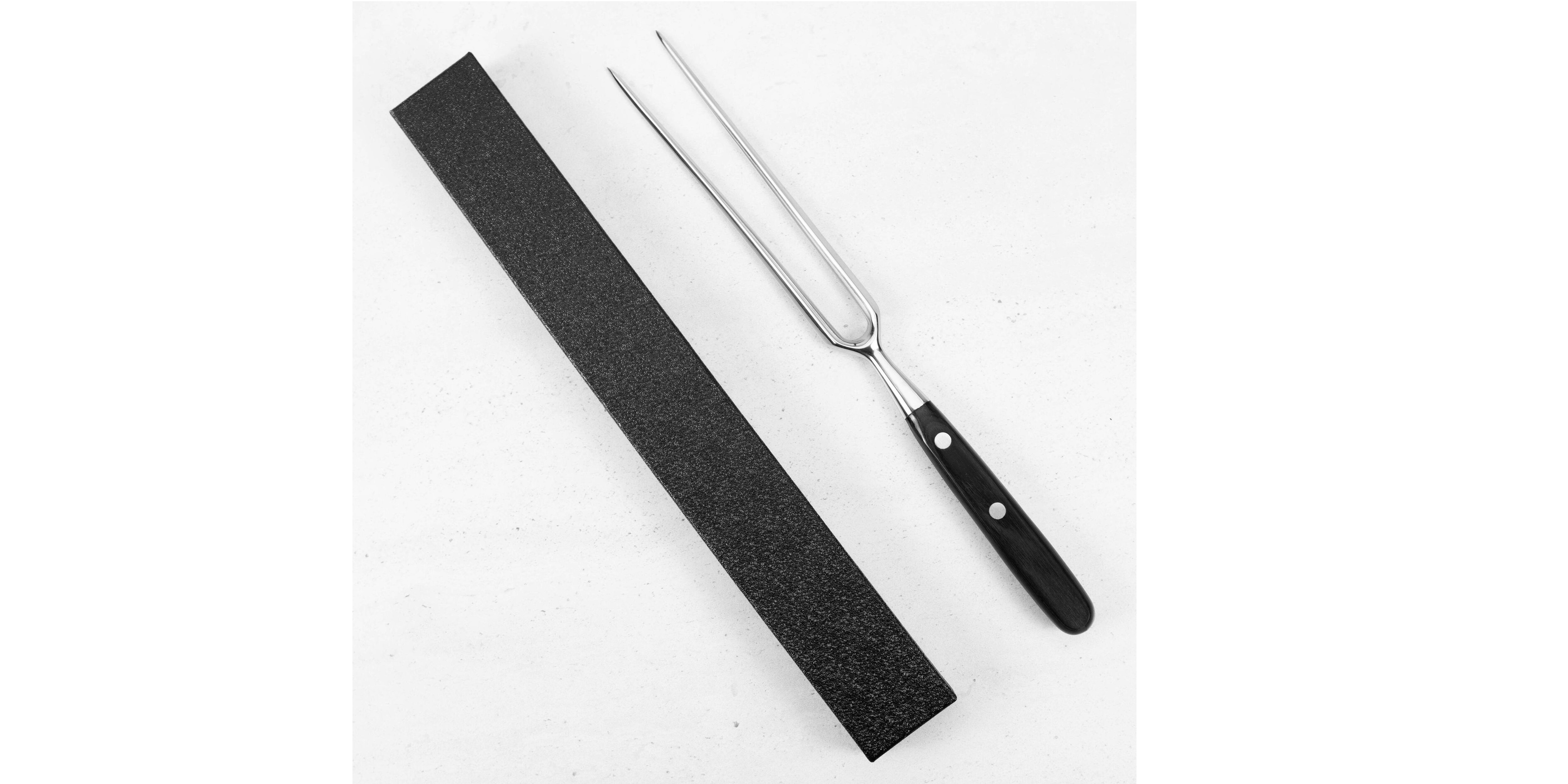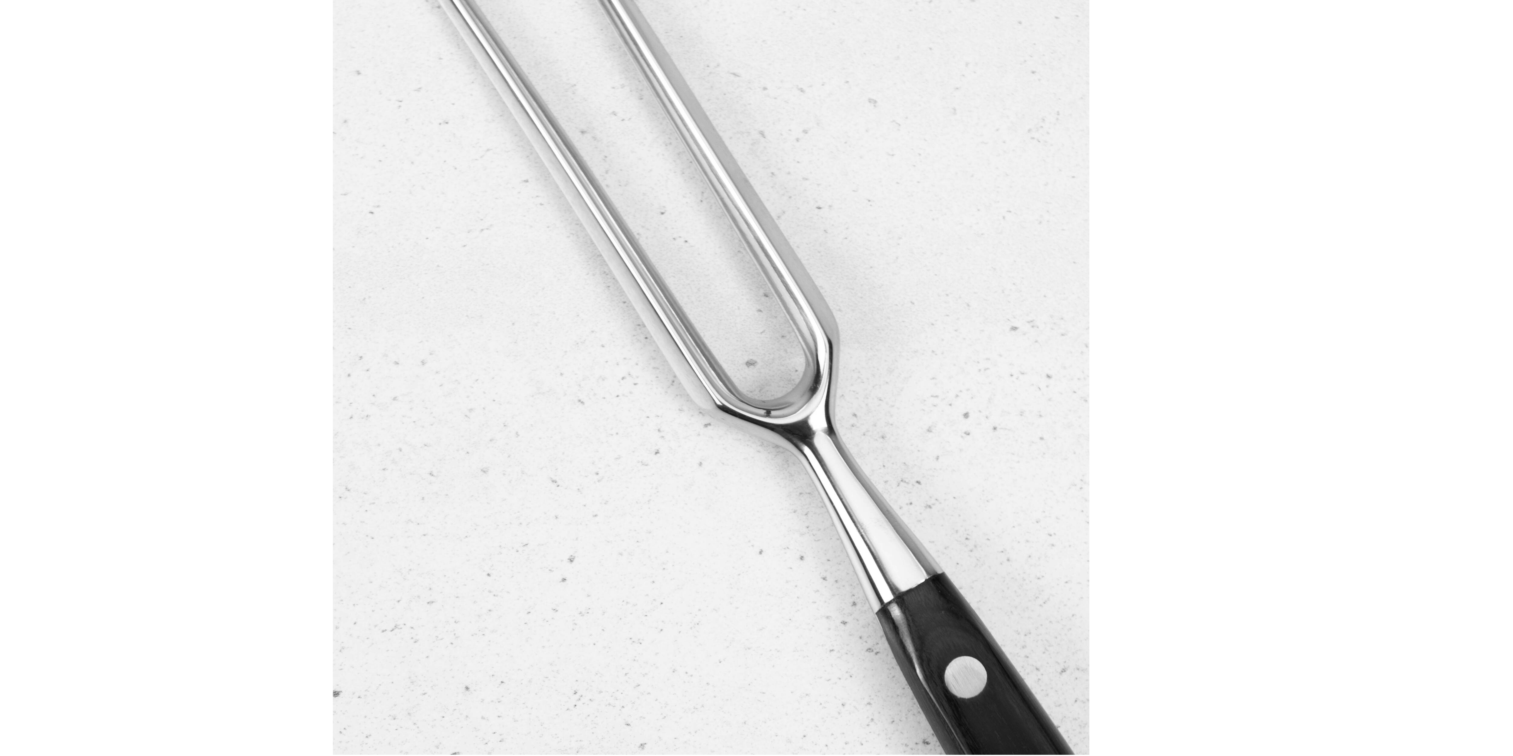 Widelec marki Tojiro do porcjowania mięsa, ostrze jest wykonane z jednego kawałka stali, z unikalną wypukłą krawędzią zapewniającą niezrównaną wydajność dwa ostrza świetnie trzymają pieczeń, aby się nie zsunęła.