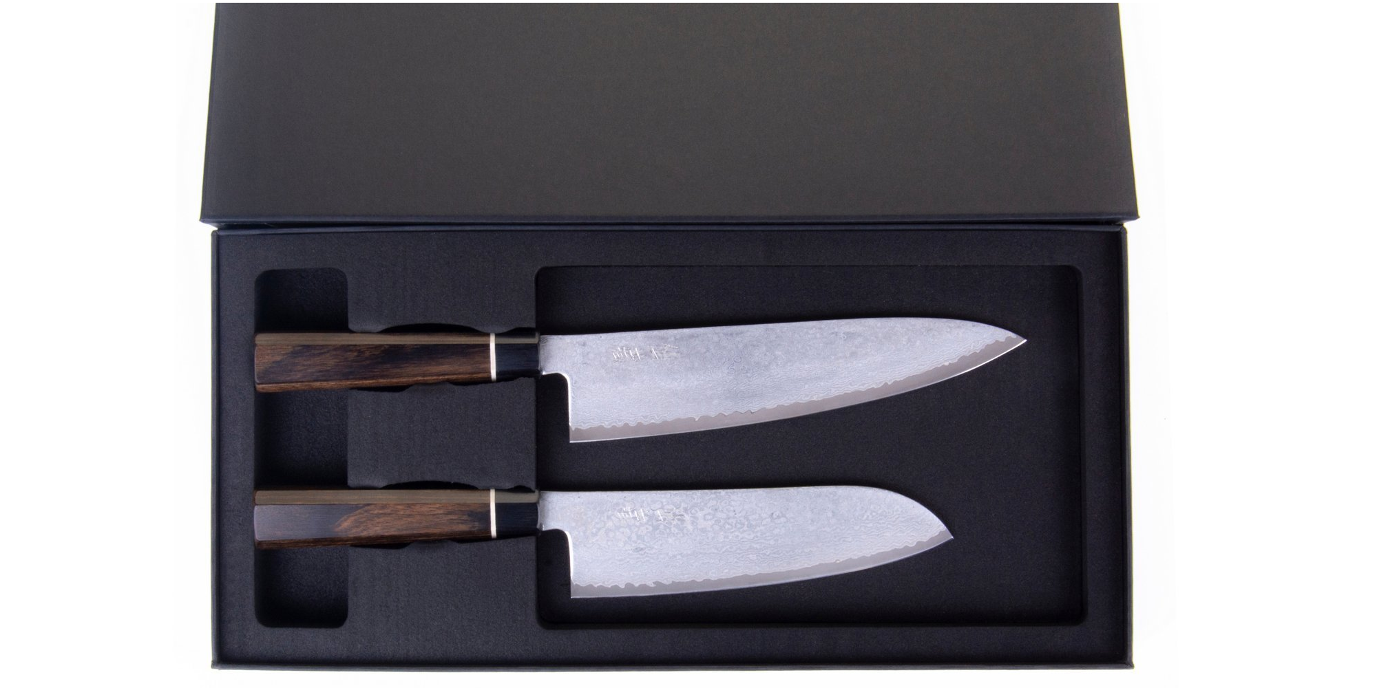 Zestaw składa się z dwóch noży, które są najbardziej potrzebne w kuchni. Jest tu zatem nóż szefa kuchni o długości 200 mm oraz jego japoński odpowiednik w postaci noża Santoku o długości ostrza 167 mm. Santoku to wielofunkcyjny nóż w japońskim stylu, będący odpowiednikiem popularnego na zachodzie noża szefa kuchni. Jego nazwa oznacza „trzy zalety”, ewentualnie „trzy cnoty”. Nie bez powodu – nóż ten, sprawdzi się podczas krojenia mięsa, ryb i warzyw. Dodatkowym elementem kompletu jest eleganckie i ekskluzywne opakowanie kartonowe, idealne nadające się na prezent.