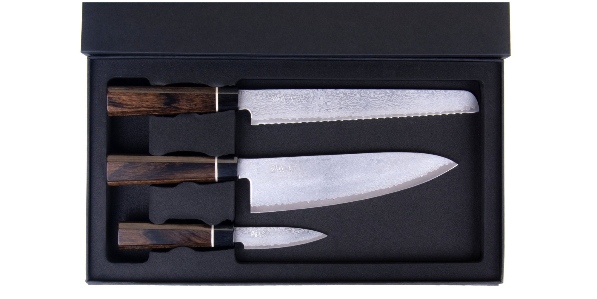 Zestaw składa się z trzech noży, które są najbardziej potrzebne w kuchni. Jest tu zatem nóż szefa kuchni o długości 200 mm oraz nóż do pieczywa Bread o długości ostrza 220 mm. Nóż ten przyda się nie tylko do odkrawania kromek chleba, ale i do pracy z innymi produktami o twardych skórkach – pomidorami, cytrusami itd. Nadaje się także do krojenia czekolady. Charakterystyczne ząbkowane ostrze, doskonale radzi sobie z wypieczoną skórką chleba bez miażdżenia miękkiego wnętrza. Uzupełnieniem zestawu jest nóż Petty o długości 120 mm. Petty to uniwersalne ostrze będące mniejszą wersją noża szefa kuchni. Ma wszechstronne zastosowanie dzięki czemu jest bardzo chętnie wybieranym ostrzem przez miłośników sztuki kulinarnej. Dodatkowym elementem kompletu jest eleganckie i ekskluzywne opakowanie kartonowe, idealne nadające się na prezent.