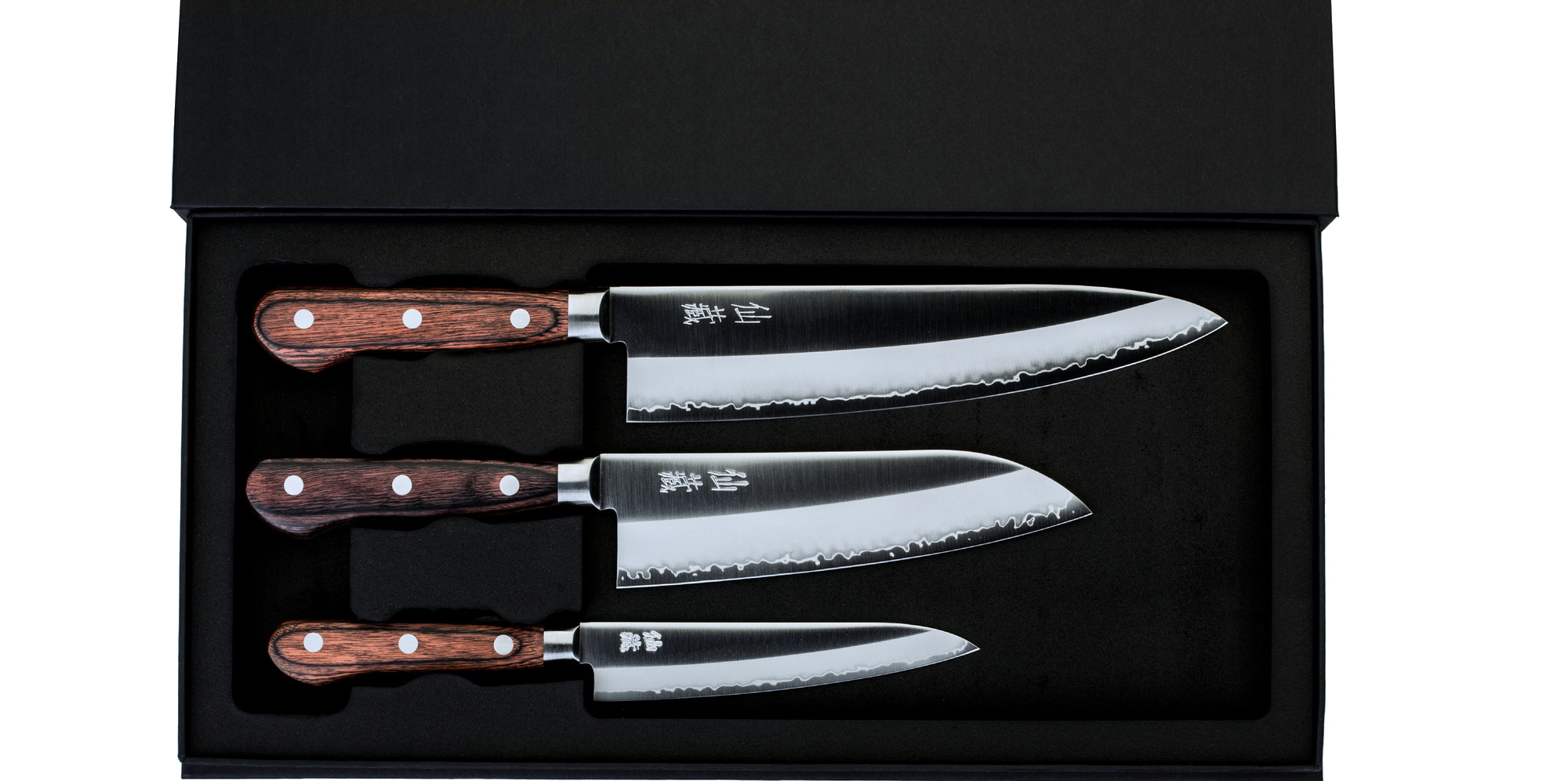 Zestaw Senzo Clad, w którego skład wchodzą trzy najbardziej potrzebne noże w kuchni: Gyuto czyli odpowiednik europejskiego noża szefa kuchni o długości 210 mm oraz nóż Santoku o długości ostrza 165 mm. Santoku to wielofunkcyjny nóż w japońskim stylu, będący odpowiednikiem popularnego na zachodzie noża szefa kuchni. Jego nazwa oznacza „trzy zalety”, ewentualnie „trzy cnoty”. Nie bez powodu – nóż ten, sprawdzi się podczas krojenia mięsa, ryb i warzyw. Uzupełnieniem zestawu jest nóż Paring 90 mm. Paring to nóż do obierania ale to także specjalista od prac drobnych i tych nieco bardziej skomplikowanych, przydaje się tam, gdzie potrzeba krótkiego, ostrego ostrza. Dodatkowym elementem kompletu jest eleganckie i ekskluzywne opakowanie kartonowe, idealne nadające się na prezent.