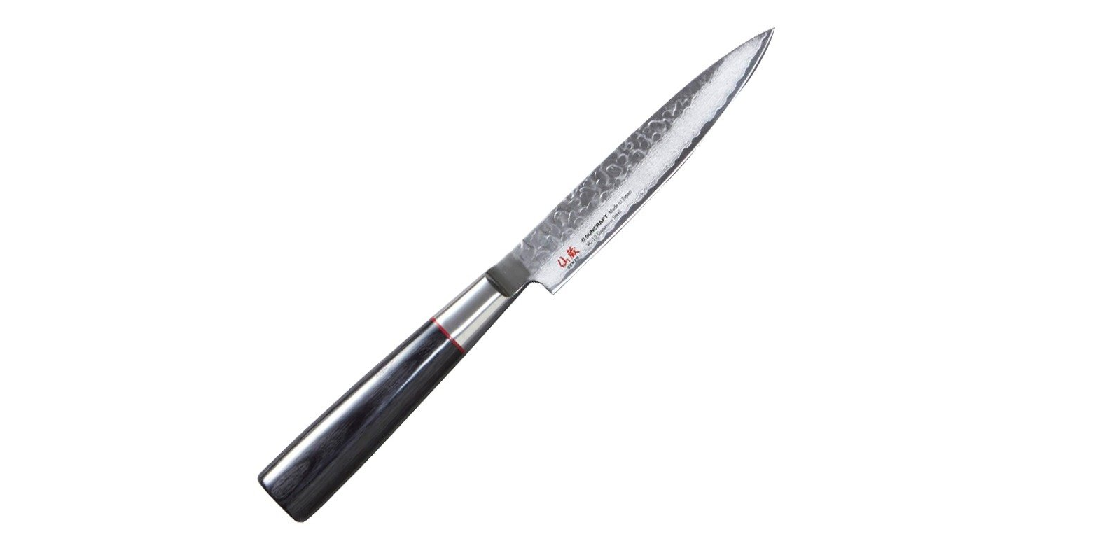 Noże SENZO CLASSIC cechuje bardzo wyrafinowana konstrukcja. Na powierzchni uchwytu wykonanego z tzw. Pakkawood*** w kolorze czarnym nie ma nitów, co czyni je niezwykle eleganckim. Czerwony pierścień u nasady ostrza przyciąga wzrok, a młotkowanie ostrza „Tsuchime” nie tylko efektownie wygląda – sprawia również, iż krojone produkty nie przywierają do noża i łatwo ześlizgują się z ostrza.