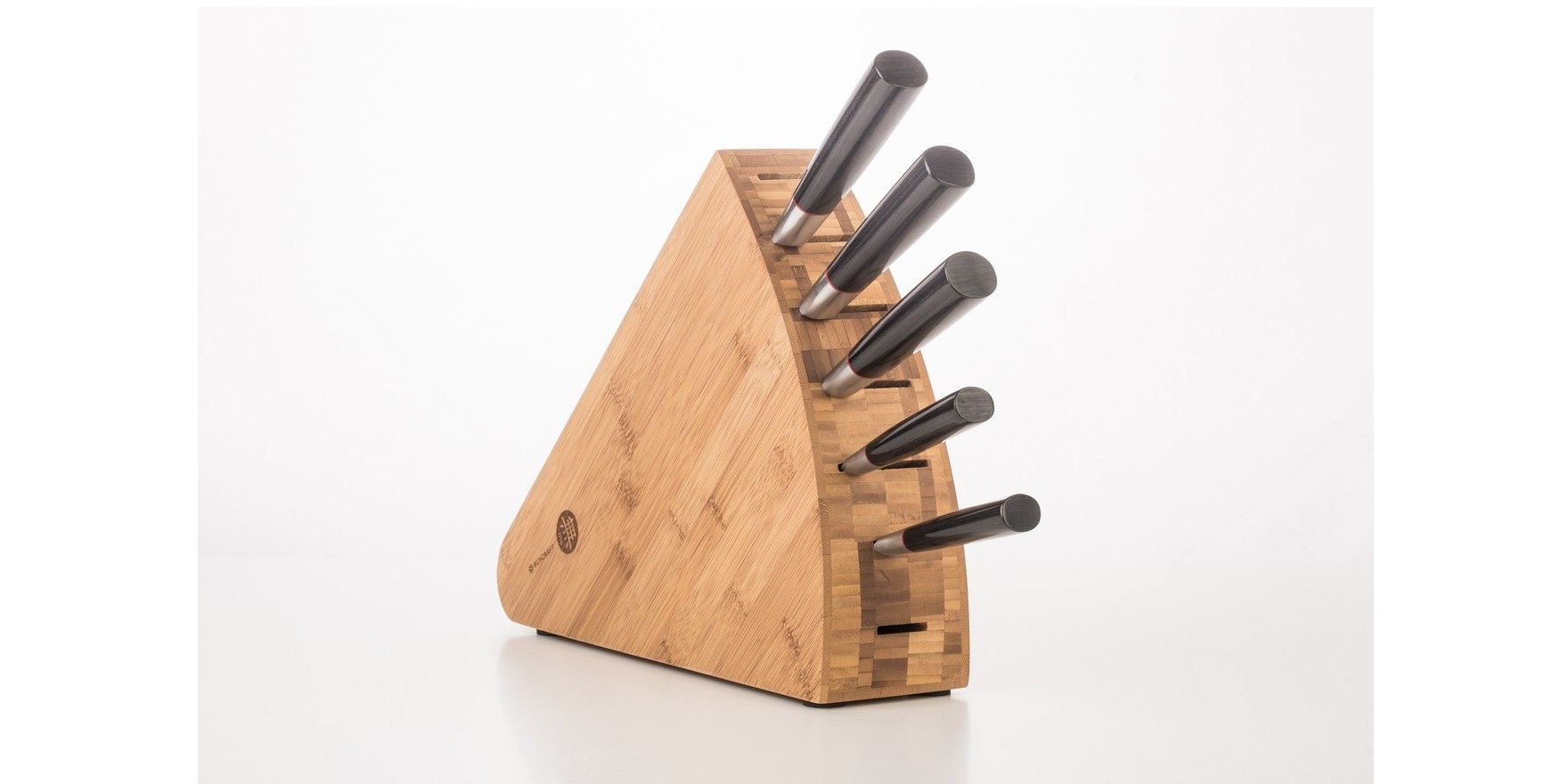 Zestaw składa się z pięciu najbardziej potrzebnych noży w kuchni. Znajdziemy tu zatem nóż szefa kuchni o długości 200 mm oraz jego mniejszego odpowiednika w postaci noża Utility o długości ostrza 120 mm. Jest również niezwykle poręczny, tradycyjny japoński nóż Santoku a także mały nóż do obierania Paring 80 mm. Uzupełnieniem jest nóż do pieczywa posiadający ząbkowaną krawędź tnącą. Dodatkowym elementem kompletu jest blok do przechowywania noży, wykonany z trwałego, karbonizowanego drewna bambusowego. Posiada siedem otworów przystosowanych do różnej wielkości ostrzy, co daje możliwość dalszej rozbudowy zestawu. Dla większej stabilności blok wyposażono w antypoślizgowe stopki.