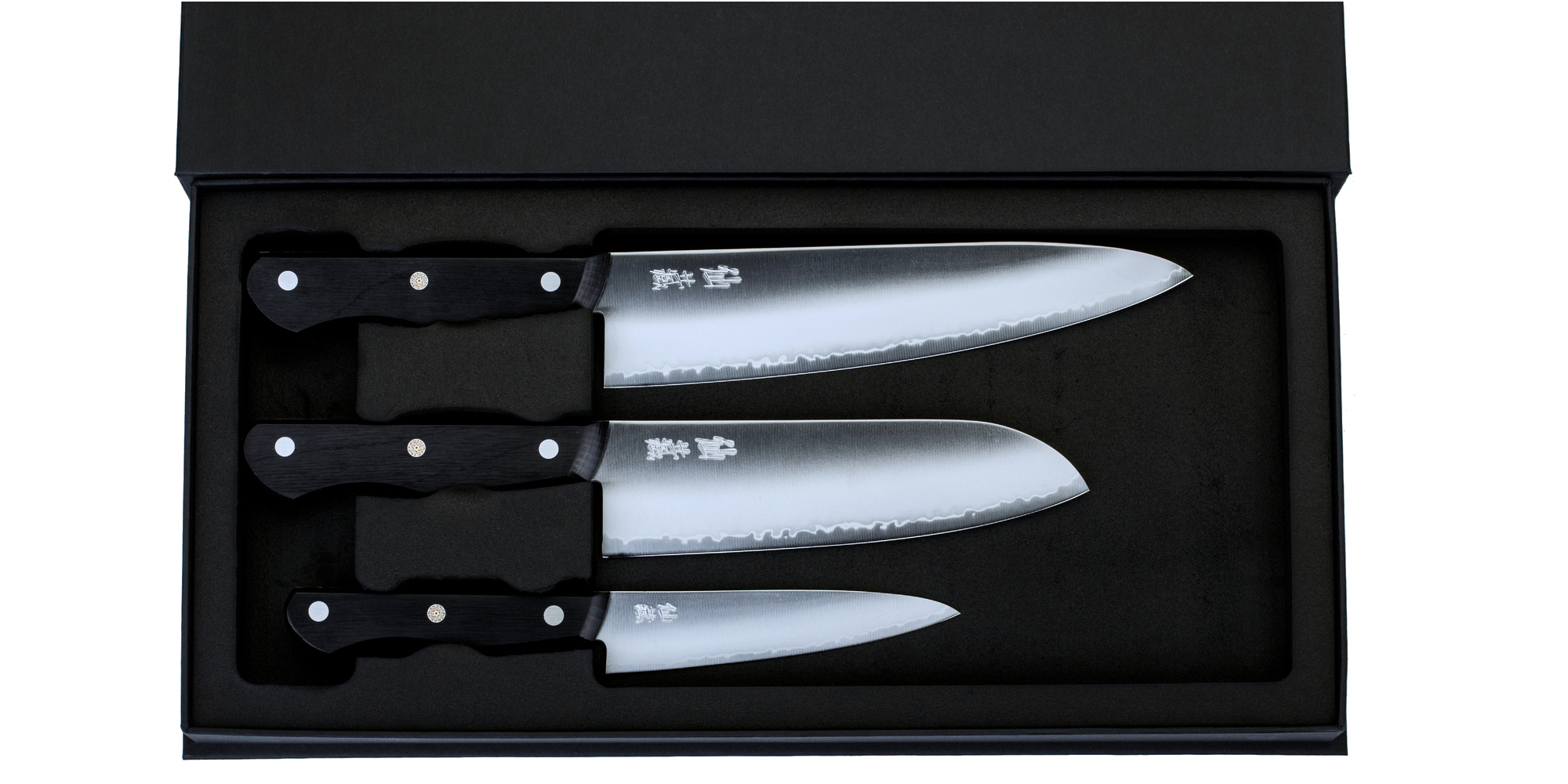 Zestaw składa się z trzech niezbędnych noży. Jest tu zatem nóż Szefa kuchni o długości 200 mm oraz jego japoński odpowiednik w postaci noża Santoku o długości ostrza 167 mm. Santoku to wielofunkcyjny nóż w japońskim stylu, będący odpowiednikiem popularnego na zachodzie noża szefa kuchni. Jego nazwa oznacza „trzy zalety”, ewentualnie „trzy cnoty”. Nie bez powodu – nóż ten, sprawdzi się podczas krojenia mięsa, ryb i warzyw. Uzupełnieniem zestawu jest nóż Petty o długości ostrza 120 mm. Petty to uniwersalne ostrze będące mniejszą wersją noża szefa kuchni. Ma wszechstronne zastosowanie dzięki czemu jest bardzo chętnie wybieranym ostrzem przez miłośników sztuki kulinarnej. Dodatkowym elementem kompletu jest eleganckie i ekskluzywne opakowanie kartonowe, idealne nadające się na prezent.